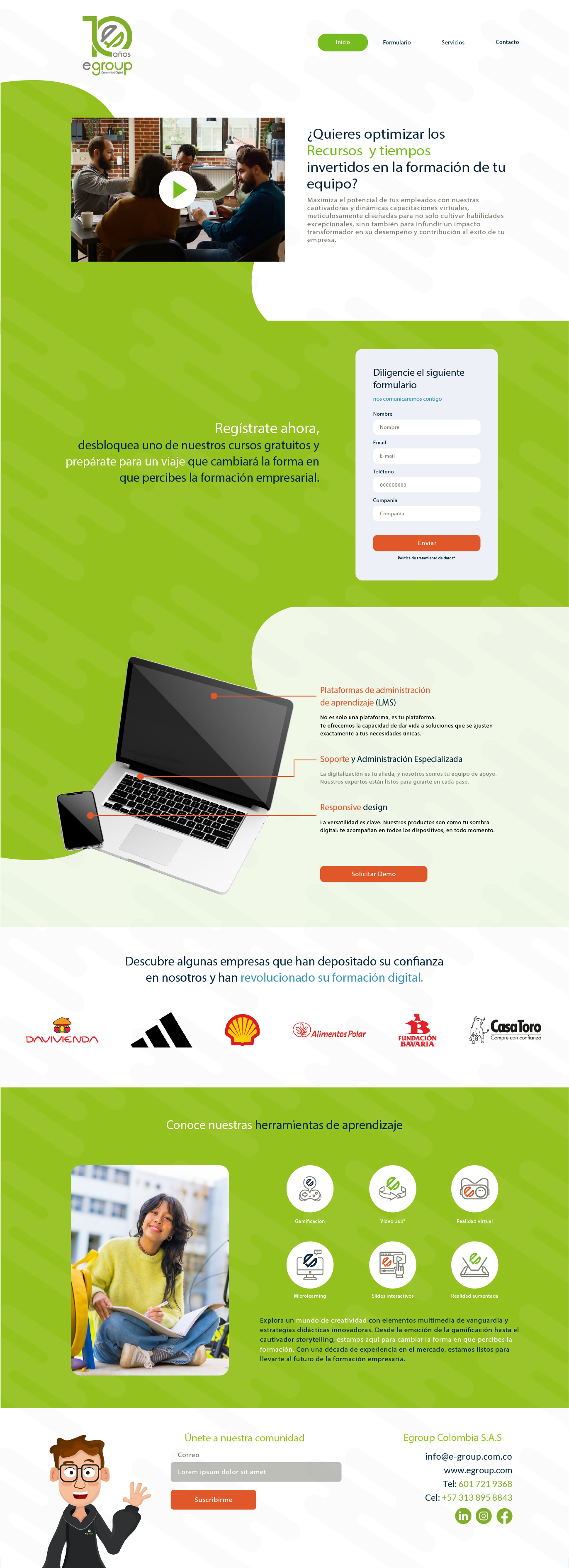 La página web presenta un diseño moderno y fresco, dominado por una paleta de colores verde limón y blanco que transmite crecimiento y aprendizaje. Los elementos visuales incluyen imágenes corporativas, iconografía limpia y un diseño que combina formas orgánicas con bloques bien estructurados. La identidad visual es consistente y profesional, enfocada en el sector educativo empresarial.